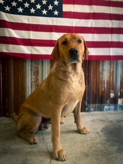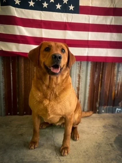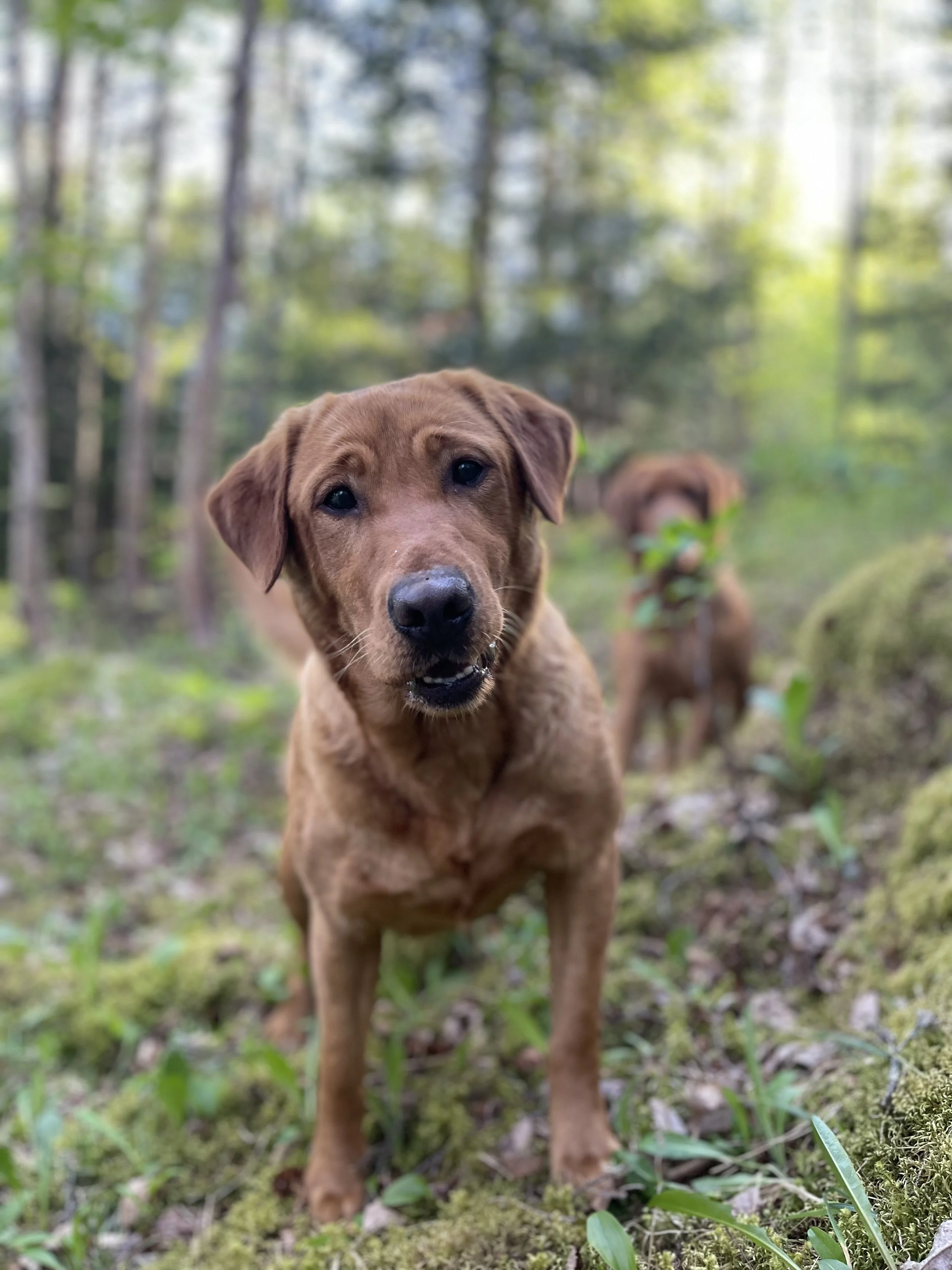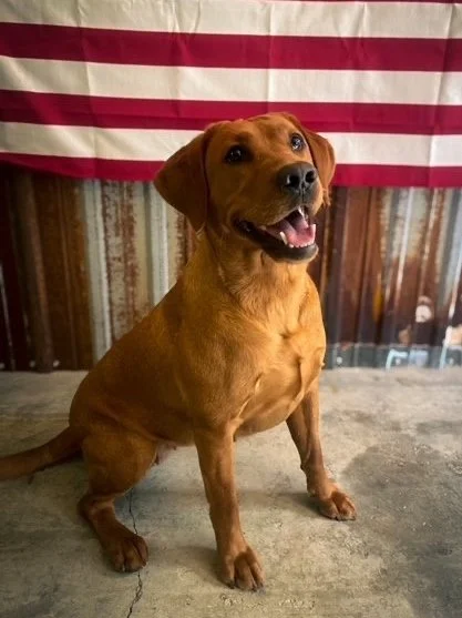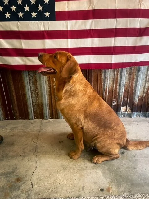 Penny is a pointing fox red labrador, but has been trained to flush birds. Her offspring may carry the pointing trait, making for an extremely capable hunting companion.
